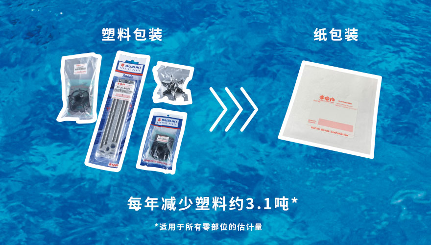 通过将铃木船外机纯正零部件和铃木船外机本体的塑料包装替换为纸/可持续生产材料,减少使用了大约128吨*的塑料。