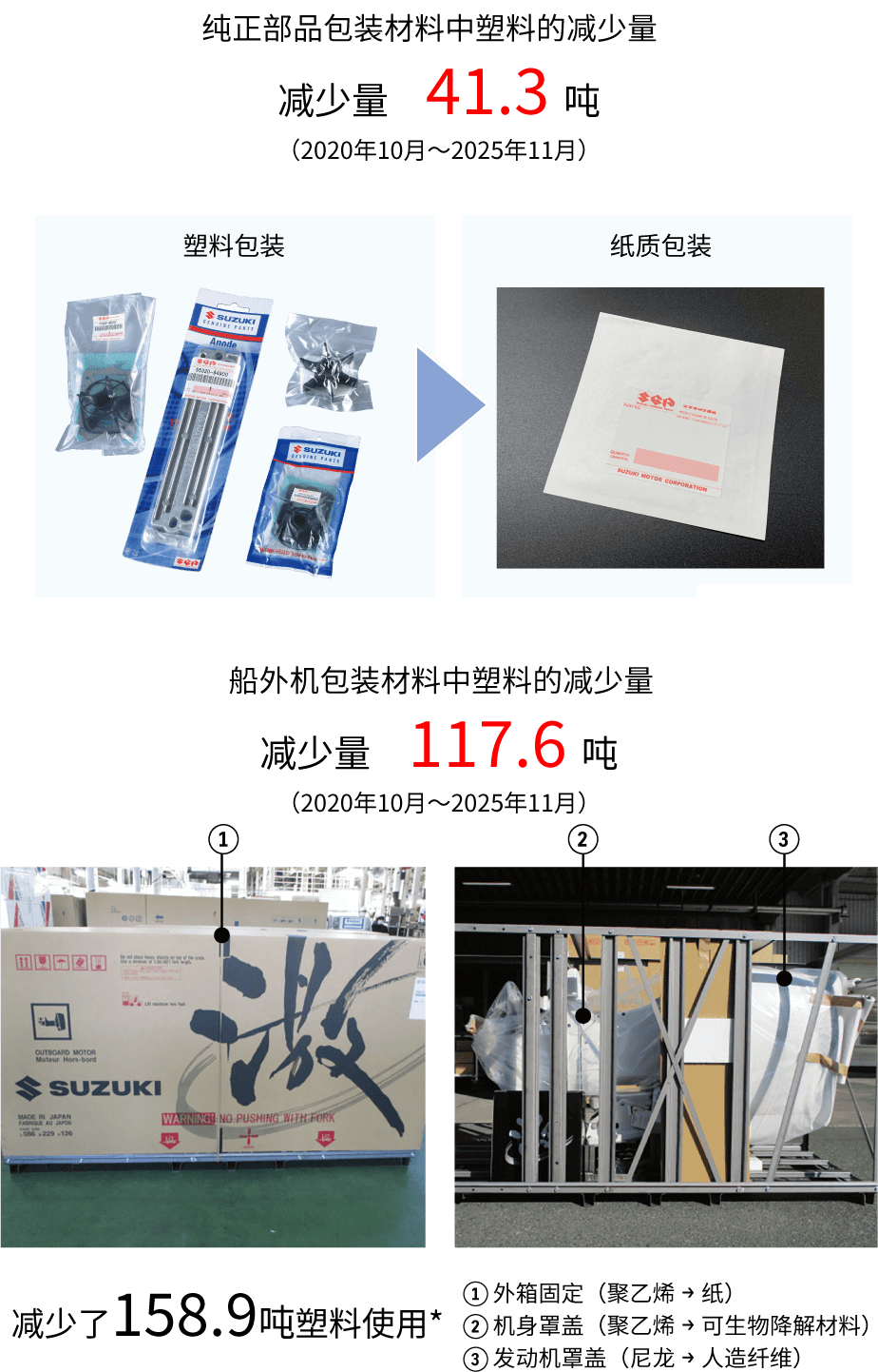 通过将铃木船外机纯正零部件和铃木船外机本体的塑料包装替换为纸/可持续生产材料,减少使用了大约158.9吨*的塑料。