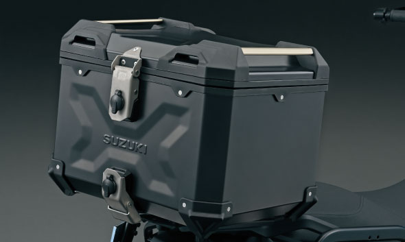 SUZUKI标志的V-STROM铝合金边箱。每个最大承重量3kg,每个箱体容量 37L。